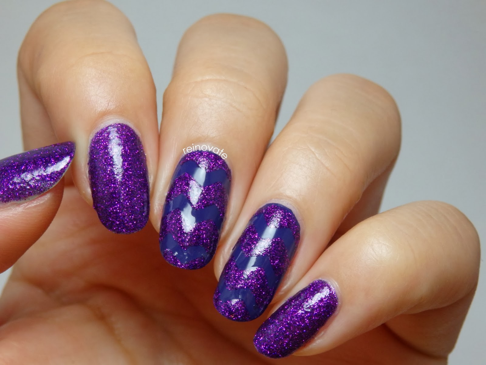 Today I have a matching mani that I did with my dear friend Rei. We both used China Glaze Queen B for the blue creme, and Zoya Carter for the purple glitter. Both of these are gorgeous on their own, so I thought they would be even nicer combined. Looks like I was right! I used Linda’s Nail Vinyls in the chevron pattern to create this look.