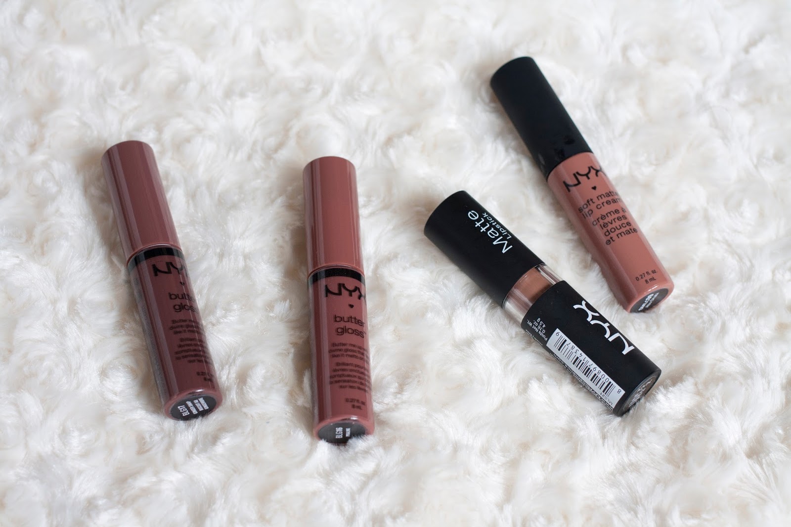 I was clearly in a mood for nudes/browns when I got these – I’m definitely happy with my picks, though. I have a bunch of the other Soft Matte Lip Creams and a couple lipsticks, so I thought that I’d try something new with the Butter Glosses. The products I grabbed were: NYX Matte Lipstick in Butter, NYX Soft Matte Lip Cream in Abu Dhabi, and two NYX Butter Glosses in Praline and Ginger Snap.