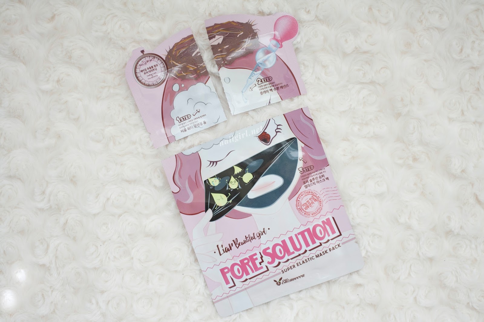 Another of the items that Elizavecca kindly sent me for review is this 3-Step mask pack! I was pretty excited to try this as I’ve never tried a three step mask before, and was keen to see how it would help my skin. The one that was selected for me is the Pore Solution mask, which is meant to tighten pores. I do have oily skin and some gross pores around my nose, so I had high hopes for this. I was initially super confused by the packaging of this mask – the image on the front of the packaging seems to imply that this is a peel off mask that physically pulls gunk from your pores, when that isn’t the case. The mask also comes with a cleanser and essence to prep the skin and make the most of the beneficial ingredients of this mask.