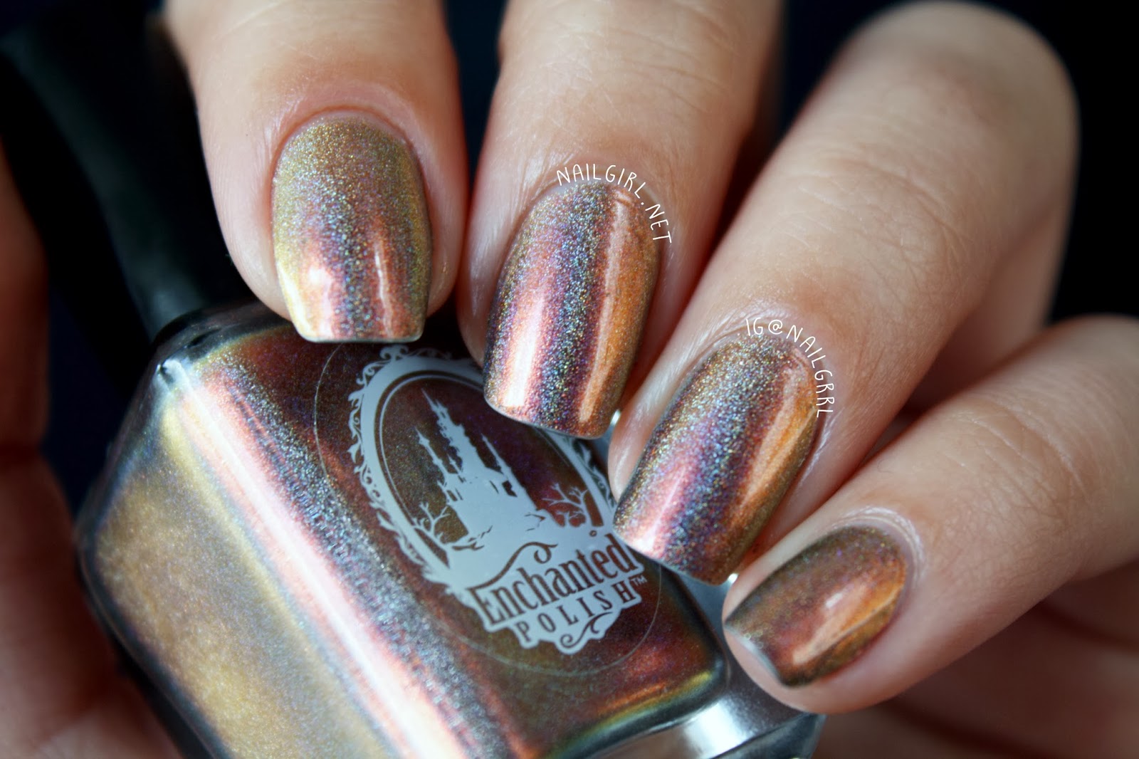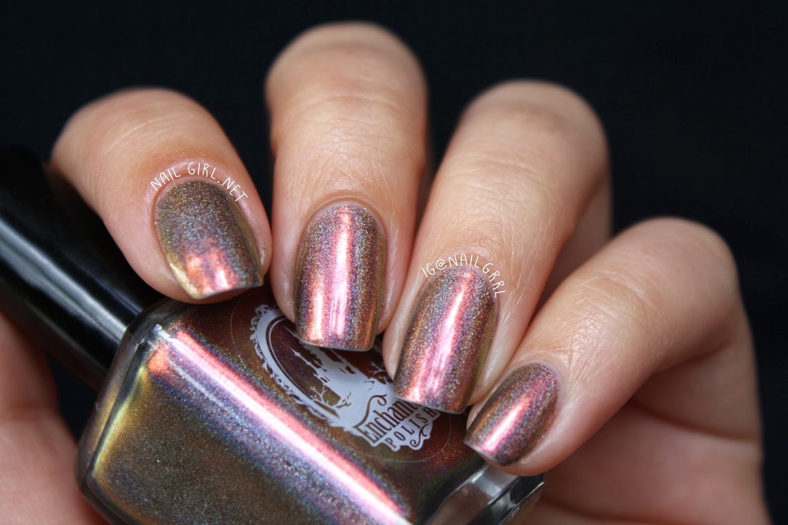 Today I have the lovely Enchanted Polish Congratulations from the Time to Pretend collection. Congratulations is a gold/red/orange multichrome with a strong linear holographic effect.
