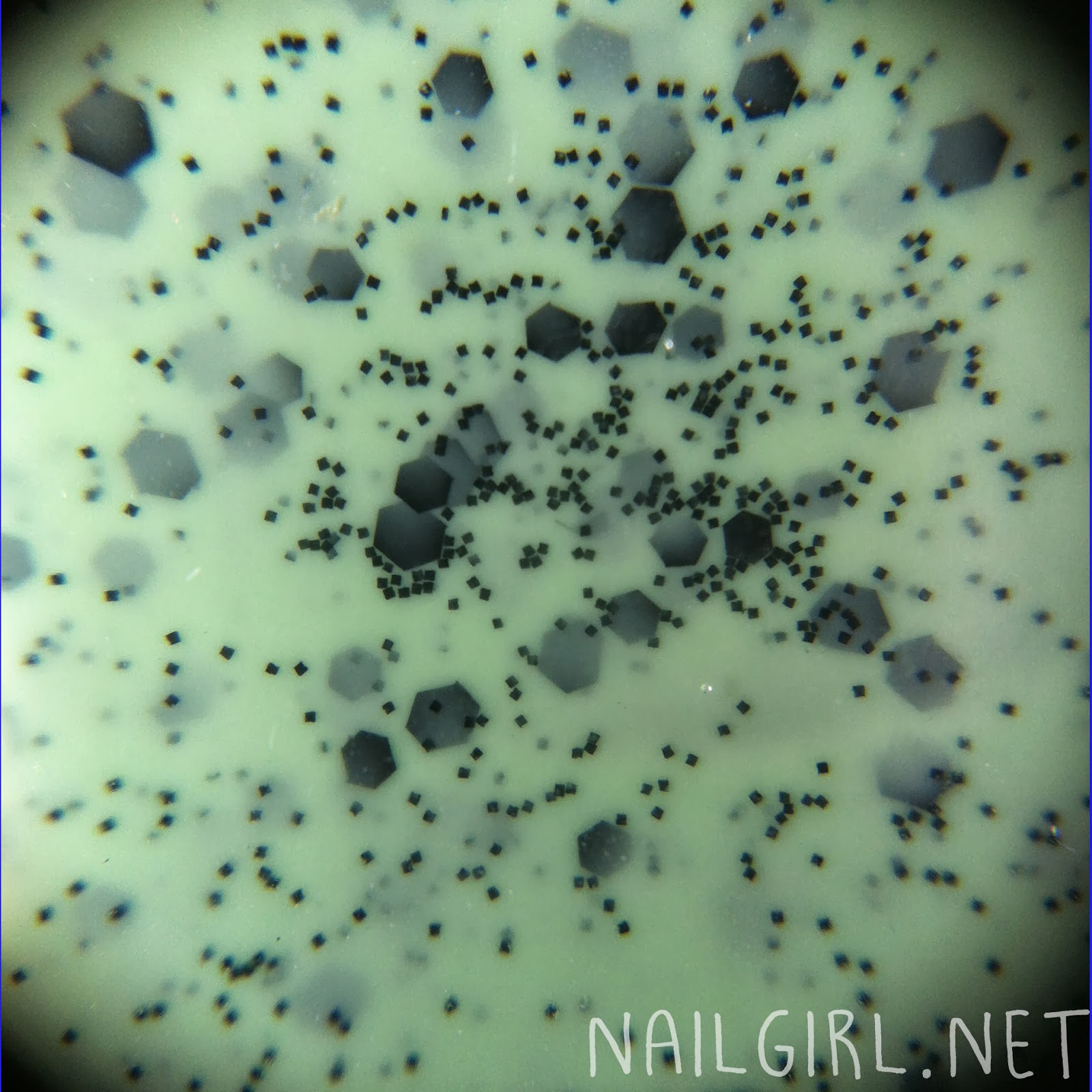 I have one of my favorite polishes ever today – Illamasqua Mottle. This was released with Illamasqua’s Imperfection collection earlier this year. Mottle has a light, pistachio green base full of small black hex glitters and tiny square glitters.