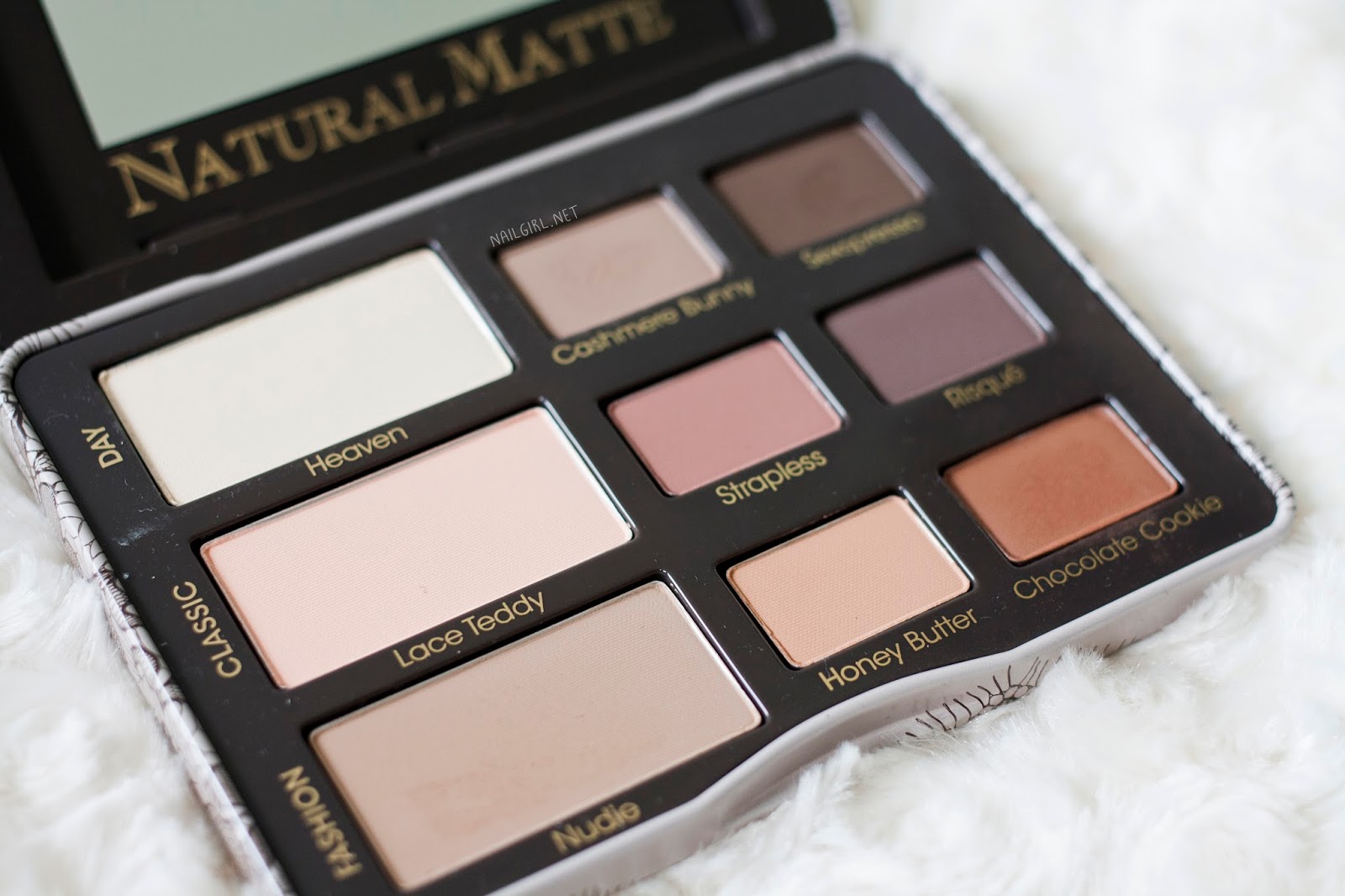 From left to right: Heaven, Cashmere Bunny, Sexpresso, Lace Teddy, Strapless, Risqué, Nudie, Honey Butter, and the top swatch is Chocolate Cookie.